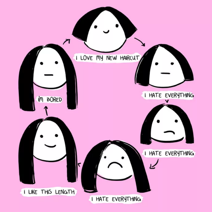 我挺喜歡我的新發(fā)型→我不開森→我不開森→我不開森→我喜歡這個長度→我有點不耐煩了,太長了→剪頭發(fā)去!